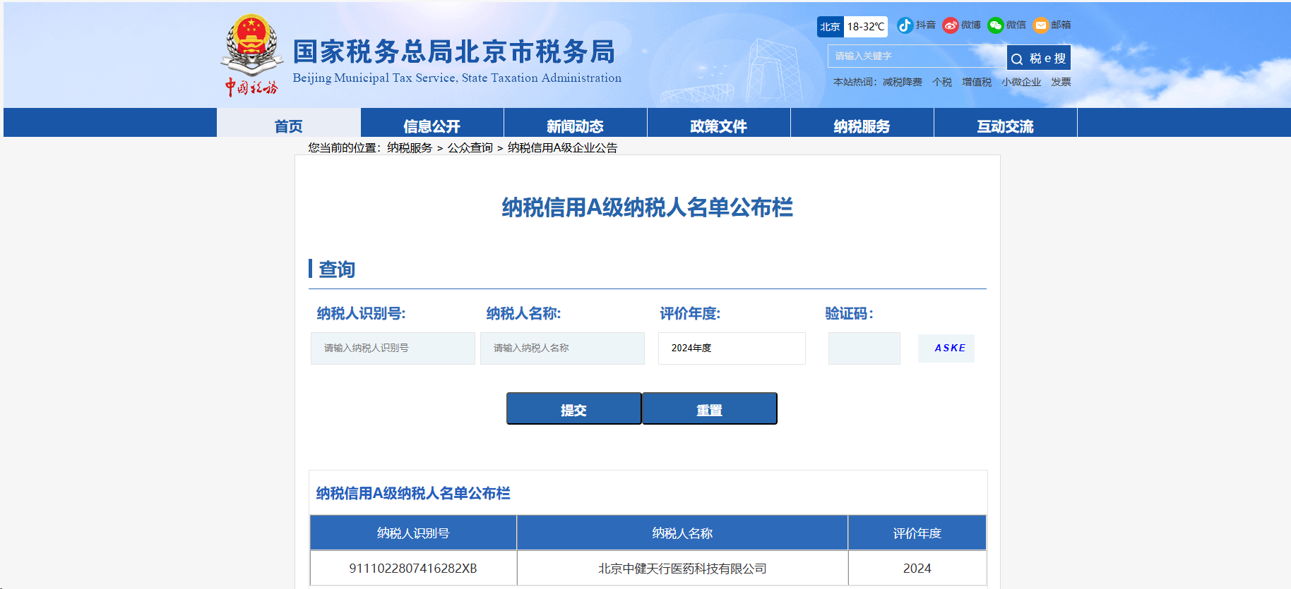 近日,國家稅務總局公布了2024年度納稅信用等級評定結果,北京中健天行醫藥科技有限公司憑借規范的稅務管理和良好的納稅信用,成功獲評“納稅信用A級企業”。