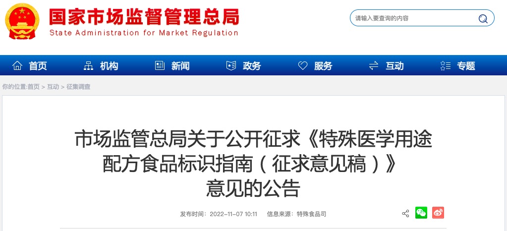 2022年11月7日,國家市場監督管理總局發布《特殊醫學用途配方食品標識指南(征求意見稿)》(下文簡稱“指南”),征求意見截止日期為2022年11月25日。此次指南公布了特醫食品小藍花標志樣式,規定特醫食品最小銷售包裝應標注特醫食品專屬標志。