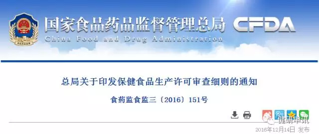 各省、自治區、直轄市食品藥品監督管理局,新疆生產建設兵團食品藥品監督管理局: 根據《中華人民共和國食品安全法》《食品生產許可管理辦法》《保健食品注冊與備案管理辦法》《食品生產許可審查通則》等有關規定,國家食品藥品監督管理總局組織制定了《保健食品生產許可審查細則》,現予印發,自2017年1月1日起施行。 食品藥品監管總局 |