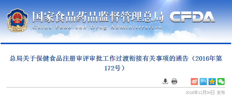 2016年11月15日,國家食品藥品監督管理總局印發了《保健食品注冊審評審批工作細則(2016版)》(以下簡稱《細則》),明確了保健食品注冊審評審批的工作程序和要求。為保證保健食品注冊審評審批工作平穩有序開展,現就《細則》實施前已受理注冊申請的審評審批事項通告如下:
