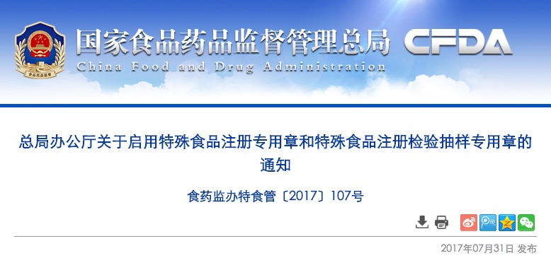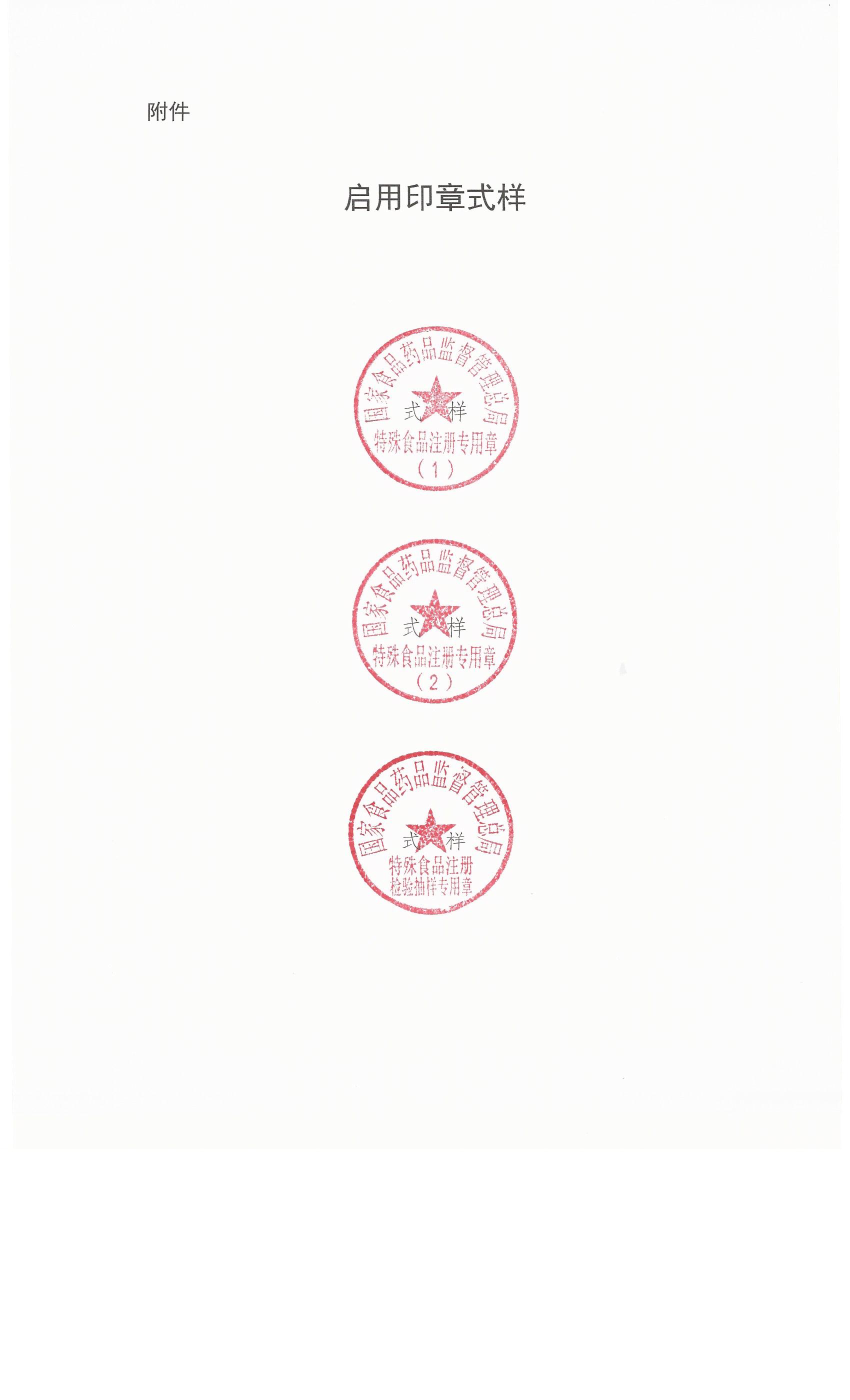 根據(jù)《保健食品注冊與備案管理辦法》(國家食品藥品監(jiān)督管理總局令第22號)、《特殊醫(yī)學用途配方食品注冊管理辦法》(國家食品藥品監(jiān)督管理總局令第24號)和《嬰幼兒配方乳粉產(chǎn)品配方注冊管理辦法》(國家食品藥品監(jiān)督管理總局令第26號),自2017年8月1日起,啟用“國家食品藥品監(jiān)督管理總局特殊食品注冊專用章(1)”用于保健食品注冊,“國家食品藥品監(jiān)督管理總局特殊食品注冊專用章(2)”用于特殊醫(yī)學用途配方食品和嬰幼兒配方乳粉產(chǎn)品配方注冊,“國家食品藥品監(jiān)督管理總局特殊食品注冊檢驗抽樣專用章”用于特殊食品抽樣。