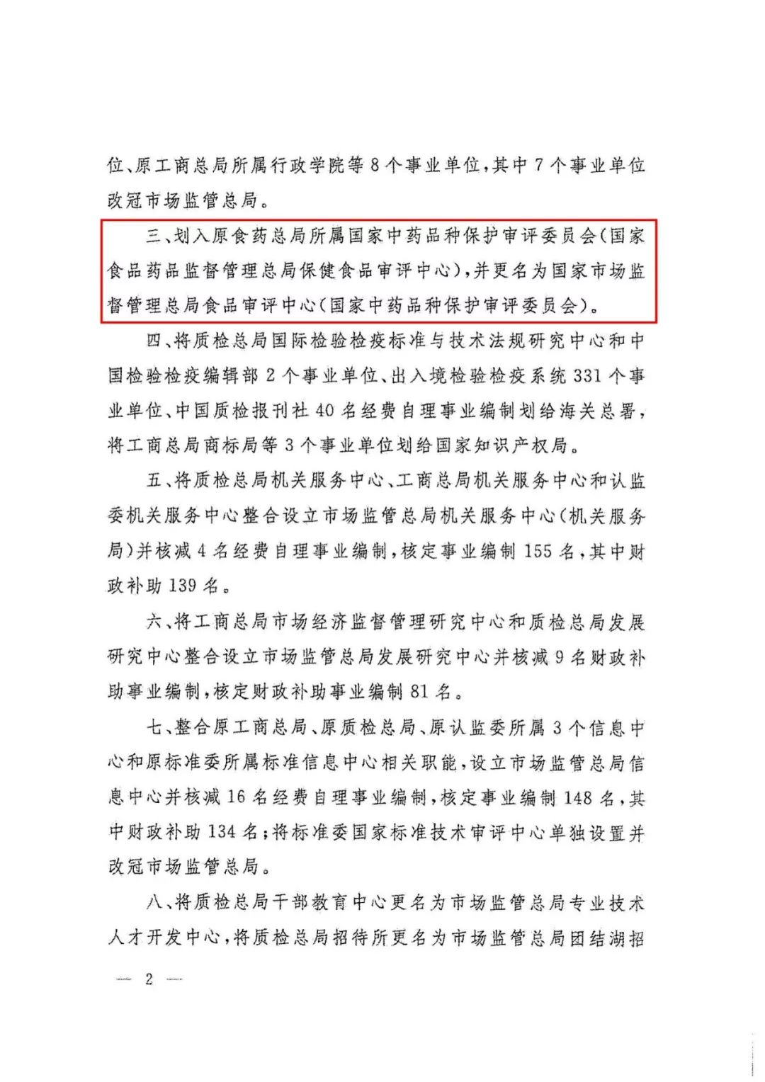 劃入原食藥總局所屬國家中藥品種保護(hù)審評(píng)委員會(huì)(國家食品藥品監(jiān)督管理總局保健食品審評(píng)中心),并更名為國家市場(chǎng)監(jiān)督管理總局食品審評(píng)中心(國家中藥品種保護(hù)審評(píng)委員會(huì))。