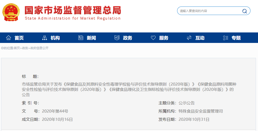 根據《中華人民共和國食品安全法》,經與國家衛生健康委協商一致,市場監管總局制定了《保健食品及其原料安全性毒理學檢驗與評價技術指導原則(2020年版)》《保健食品原料用菌種安全性檢驗與評價技術指導原則(2020年版)》《保健食品理化及衛生指標檢驗與評價技術指導原則(2020年版)》,現予印發,自公告之日起施行。