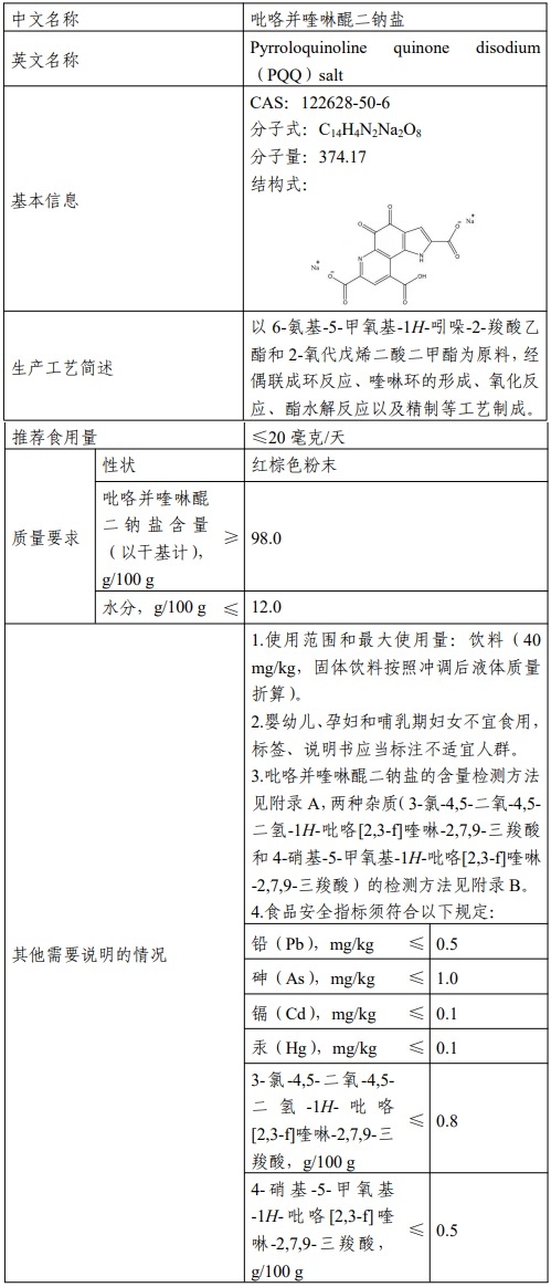 2023年2月2日,國家衛健委發布吡咯喹啉醌二鈉鹽(PQQ)受理公告,受理編號:衛食新申字(2023)第0001號,這是2023年第一個被受理的新食品原料,此前,PQQ在2022年3月于國家衛健委2022年第1號公告中已經被批準為新食品原料,其生產工藝是化學合成法,可應用于飲料領域。